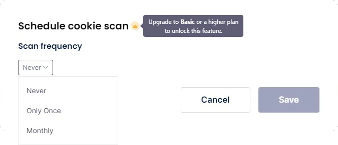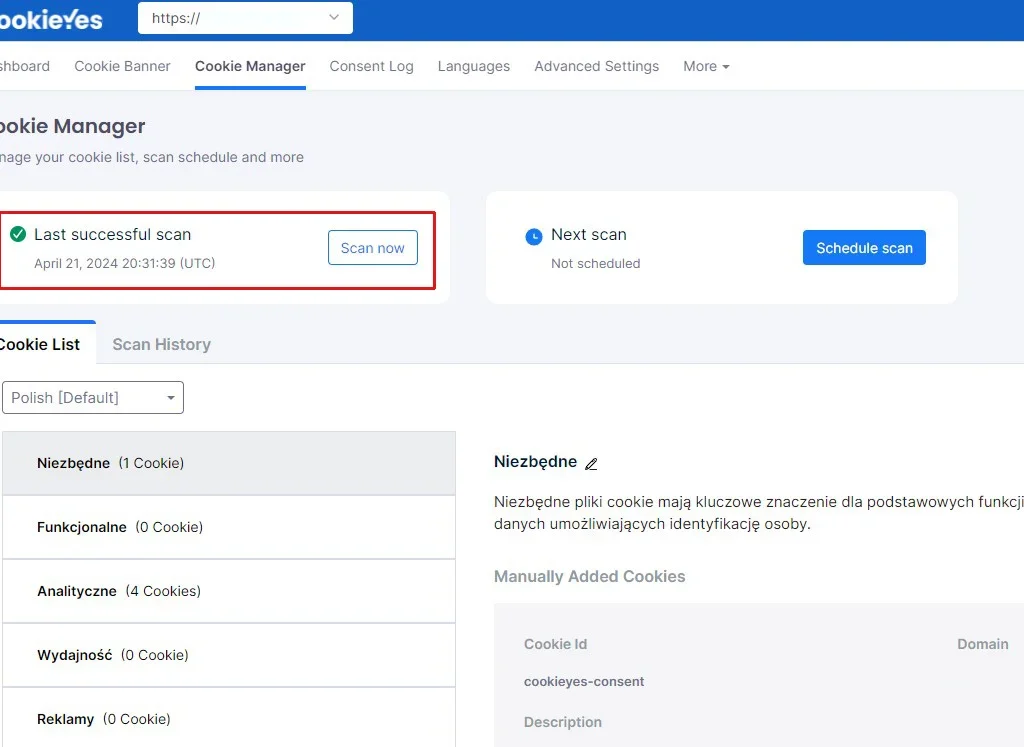 Można też ustawić harmonogram skanowania strony, jednak do tego celu trzeba by wykupić plan premium na stronie CookieYes. Inaczej proces skanowania, należy wykonywać ręcznie, jak tylko zajdzie taka potrzeba.